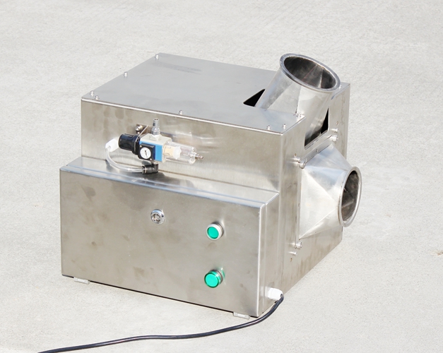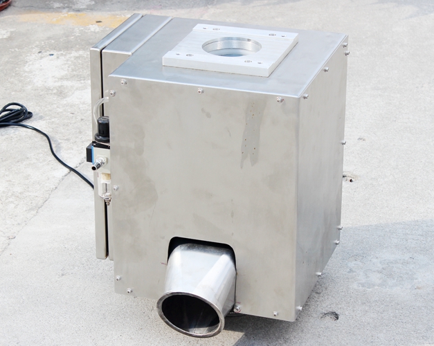 原料從料斗或送料器自由下落進入金屬分離器,如果沒有金屬雜質(zhì),原料會直接通過金屬分離器流向下端的出料口。如果檢測器檢測到原料中含有金屬,那么控制器立刻啟動分離板將金屬物和部分原料一起導向側(cè)面的排料口,然后分流板迅速恢復至正常的位置,分流板速度可調(diào),金屬分離器的檢測精度也可根據(jù)生產(chǎn)需要調(diào)節(jié),最小可檢測并分離出Φ 0.2mm的金屬顆粒。